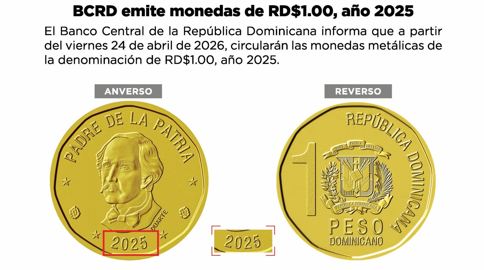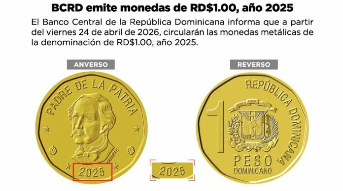 SANTO DOMINGO, RD.-El Banco Central informa que a partir del viernes 24 de abril de 2026, circularán las monedas metálicas de la denominación de RD$1.00, año 2025.